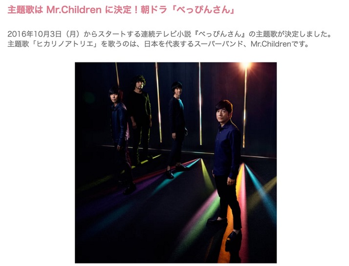 百田夏菜子出演 NHK朝ドラ『べっぴんさん』の主題歌は、Mr.Children「ヒカリノアトリエ」に決定!