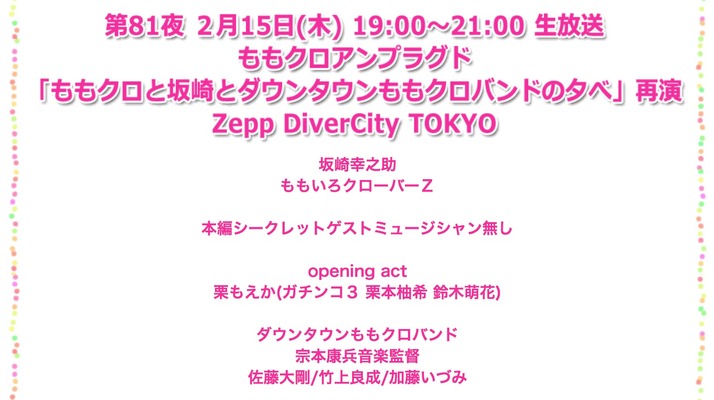 2018年1月19日17112 まとめ ももクロ侍 “有安杏果さんへ富士見市からのエール” 動画公開!「富士見市は、新たな人生を歩みだす有安さんをこれから... 0 0 0 2018年1月19日17100 まとめ ももクロ侍 “ユーキャン×ももくろちゃんZ” コラボ『音育絵本 みつけて!オノマトペ』発売決定!ももくろちゃんZの5人... 0 0 0 2018年1月19日17087 まとめ ももクロ侍 Hulu、本日より『ももいろクリスマス in 日本青年館 ~脱皮; DAPPI~』配信開始!「有安さんはもちろん、... 0 0 0 2018年1月19日17083 まとめ ももクロ侍 本日1/19(金)12時頃より富士見市第2運動公園で “有安杏果さんへのビデオメッセージ撮影”!星野市長、オリ... 0 0 0 2018年1月17日16985 2018年1月19日17080 まとめ ももクロ侍 明日1/20(土)生放送『アッコのいいかげんに1000回』ももクロ 5人揃って ゲスト生出演予定!アッコさんへ... 0 0 0 2018年1月19日17072 まとめ ももクロ侍 幕張メッセ・イベントホール開催『ももクロ 2018 OPENING』“ライブビューイング” チケットは 明日1/20(土... 0 0 0 2018年1月19日17073 まとめ ももクロ侍 有安杏果 ももクロ卒業ライブ、AbemaTVで全編 “緊急独占生中継” 決定!kwkm「アベマだ中継 、アーカイブな... 0 0 0 2018年1月19日17074 まとめ ももクロ侍 【1/19】本日のももクロ情報!しおりん出演ドラマ「女子的生活」第3話放送!「桃色つるべ」あーりん&せーりん“... 0 0 0 2018年1月18日17055 まとめ ももクロ侍 『ももクロ 2018 OPENING ~新しい青空へ~』物販情報公開!「既視感あると思ったら…」「やっぱりそう来る... 0 0 0 2018年1月18日17047 まとめ ももクロ侍 kwkm「イベントホールLV + ネットでの生中継」5人のももクロラストライブ 1/21(日)開催『ももクロ 2018 O... 0 0 0 2018年1月18日17036 まとめ ももクロ侍 『ももいろクローバーZ 2018 OPENING ~新しい青空へ~』“AE限定受付” 当落発表13時は…「やっぱりダメだ... 0 0 0 2018年1月18日17033 まとめ ももクロ侍 2/15(木) Zeppダイバーシティ開催『“公開生放送” ももいろフォーク村 第81夜』“オフィシャルHP先行” 抽... 0 0 0 2018年1月18日17034 まとめ ももクロ侍 2/2発売『日経エンタテインメント! 3月号』有安杏果&高城れに 緊急インタビュー掲載!杏果が卒業決断の経... 0 0 0 2018年1月17日16985 2018年1月18日17022 まとめ ももクロ侍 このあと8時15分より生放送!! 百田夏菜子出演『あさイチ』実況・掲示板用!kwkm「リーダーが本音でせまるぞ... 0 0 0 2018年1月18日17023 まとめ ももクロ侍 今夜放送『ミュ〜コミ+プラス』ゴボウによる “有安杏果インタビュー” オンエア決定!kwkm「今晩の吉田アナ... 0 0 0 2018年1月18日17017 まとめ ももクロ侍 【1/18】本日のももクロ情報!夏菜子「あさイチ」生出演!スポーツが好きだ!「ももクロ2018 OPENING ~新しい... 0 0 0 2018年1月17日17008 まとめ ももクロ侍 有安杏果『今まで通りももクロの5色のきれいなペンライトが揺れる景色を最後のライブでも観られたら…』5... 0 0 0 2018年1月17日17005 まとめ ももクロ侍 今夜22時より放送 文化放送『レコメン!』で “有安杏果&高城れに メッセージ” オンエア!“今夜急きょ、オ... 0 0 0 2018年1月17日16996 まとめ ももクロ侍 森脇健児『ももクロさんは常に新しい事を…』百田夏菜子『これからどうなるんだろうってワクワクは常にあ... 0 0 0 2018年1月17日16985 まとめ ももクロ侍 音組から杏果へ “5時間20分” の音楽のラブレター!完全保存版、一夜限りの放送!! フジNEXT 1/21(日)『有... 0 0 0